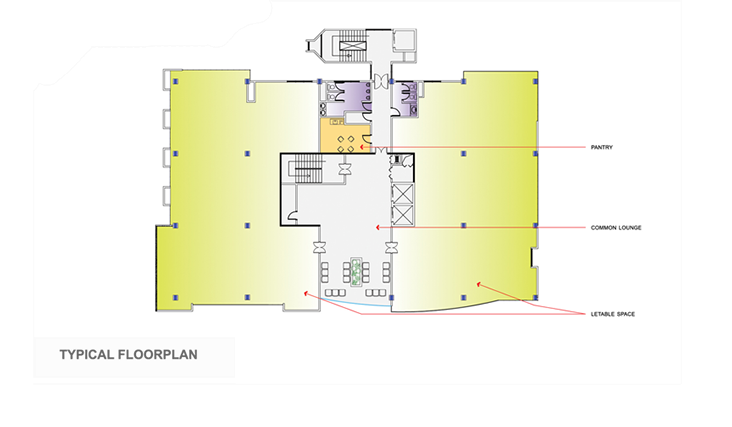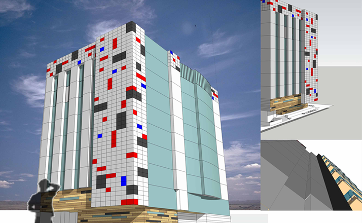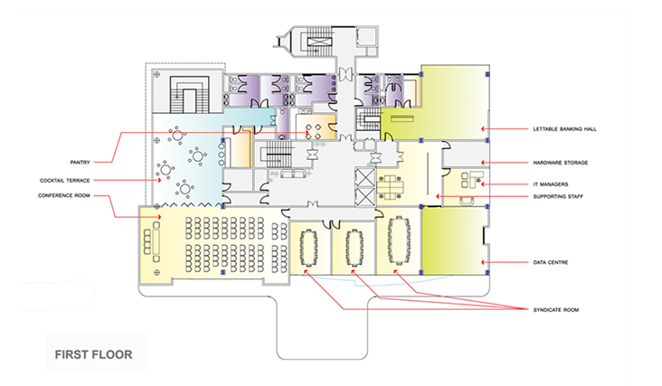 The office spaces provides nine-foot floor to ceiling windows and open-plan layouts while utilizing the state of the sustainable. Rather than the more common monolithic facade generally seen in Accra, the design plays with a facade that mimics a puzzle from the primary colors of the client's branding facade. The horizontal levels of the floor slabs are extended with a balcony, offering outdoor views to the city beyond.