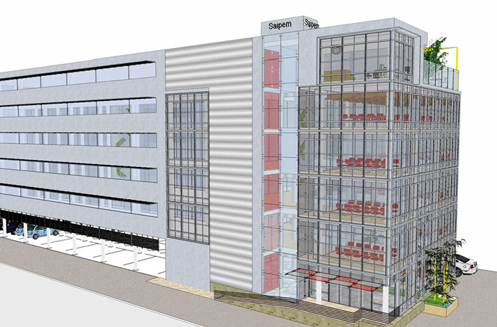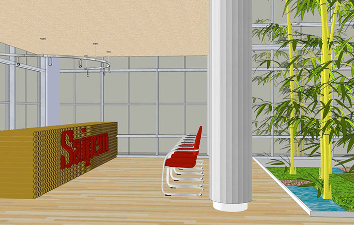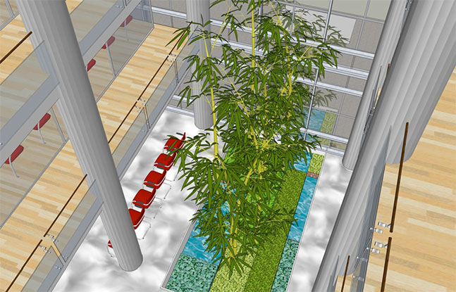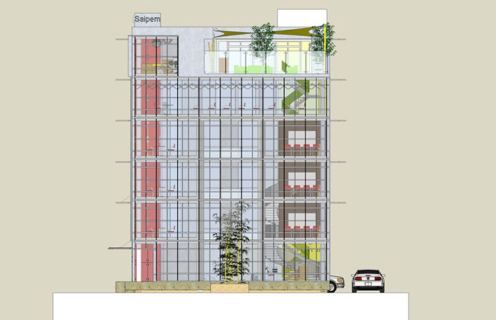 high trees. The lobby space is conceived as the centre core of the office and shared with secondary and tertiary open spaces with balconies on multiple floors which recreates the conditions at the ground level